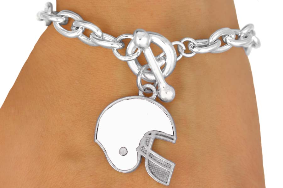 Polished Silver Tone Toggle Bracelet Suspends A White Epoxy-Filled Football Helmet.