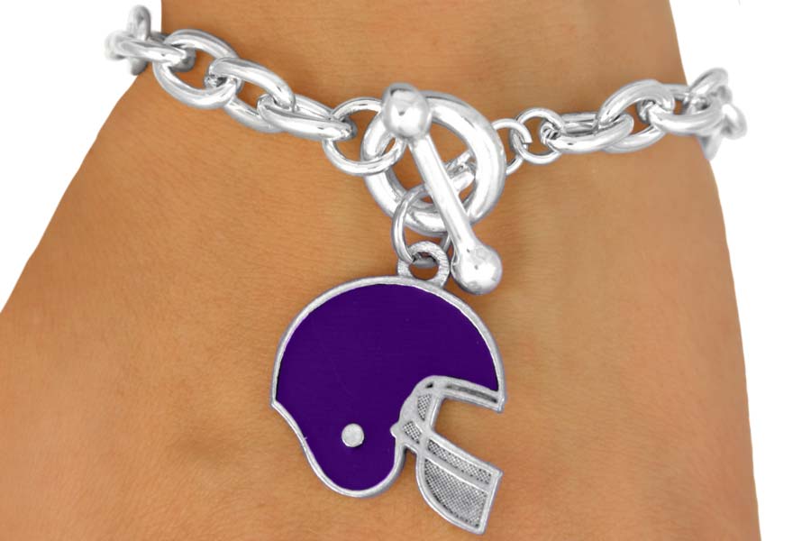 Polished Silver Tone Toggle Bracelet Suspends A Purple Epoxy-Filled Football Helmet.