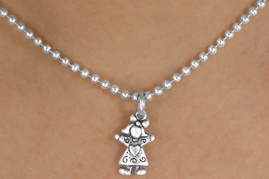 Children's Lead & Nickel Free Ball Chain Suspends A "Girl With A Heart Of Love" Charm.