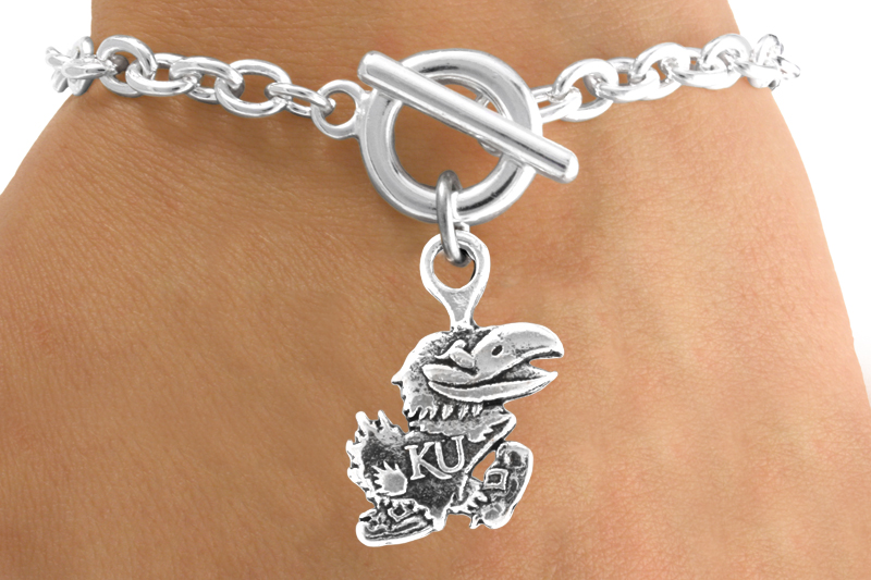Licensed College Jewelry!! Lead & Nickel Free Sterling Silver Plated Toggle Bracelet Suspends A University Of Kansas KU Jayhawks Mascot With Logo.