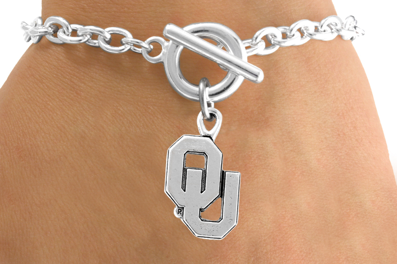 Licensed College Jewelry!! Lead & Nickel Free Sterling Silver Plated Toggle Bracelet Suspends A University Of Oklahoma "OU Sooners" Logo.