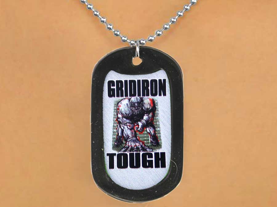 Lead & Nickel Free!! Silver Tone Ball Chain Suspends A Black-Trimmed Dog Tag With The Phrase, "Gridiron Tough" And A Football Player.