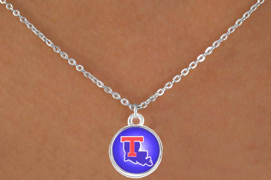 Licensed College Jewelry!! Lead & Nickel Free Sterling Silver Plated Lobster Clasp Necklace Suspends A Blue Circle With The Louisiana Tech University Logo.