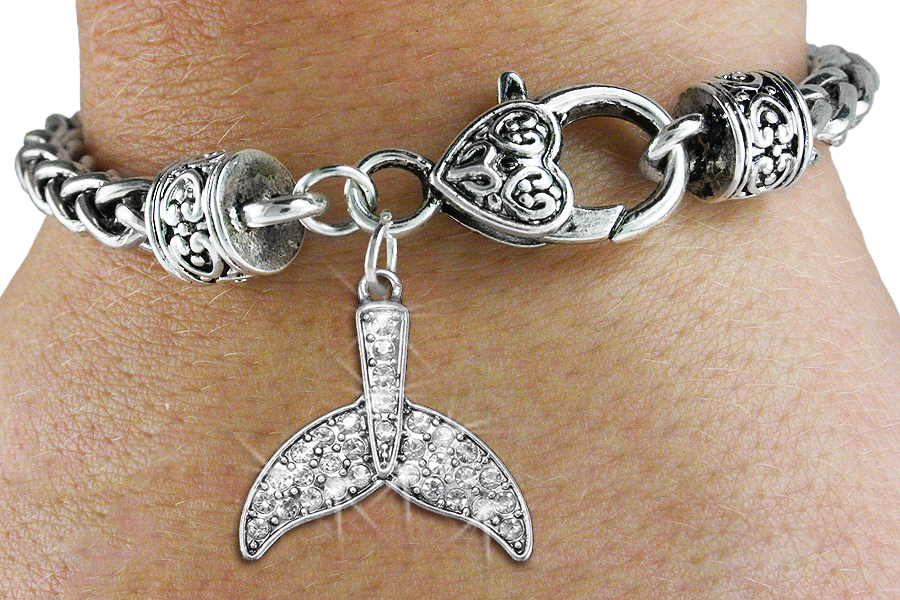 Exclusively Ours! Lead, Nickel & Cadmium Free!! Detailed Antiqued Silver Tone Fish Tail Fin Charm Is Covered In Faceted Clear Crystals And Comes On An Intricately Detailed Antiqued Silver Tone Chain Bracelet, With A Heart Shaped Lobster Clasp.