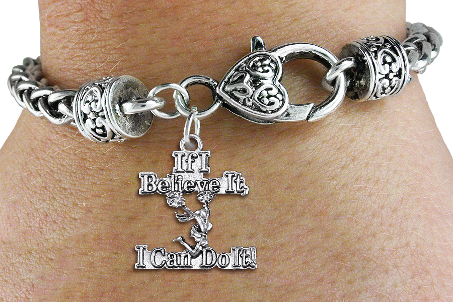 Exclusively Ours! Cadmium, Lead & Nickel Free!! Detailed Silver Tone Script "If I Believe It, I Can Do It!" Cheerleading Charm Comes On An Intricately Detailed Antiqued Silver Tone Chain Bracelet, With A Heart Shaped Lobster Clasp.