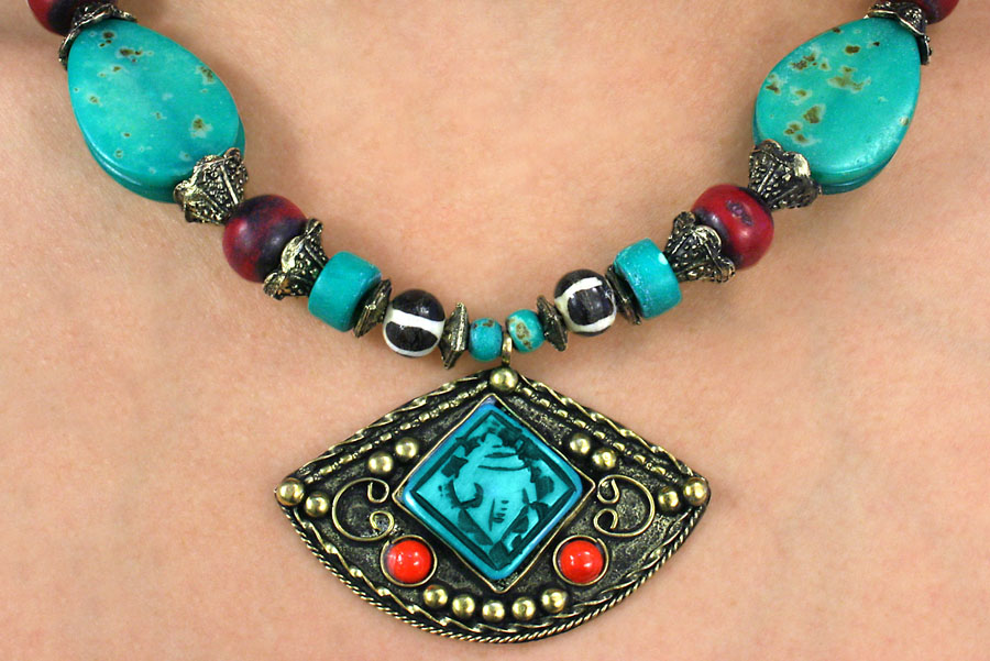 Lead & Nickel Free!! Genuine Turquoise Dyed Bone Beaded Lobster Clasp Necklace Suspends A Decorative, Antique Gold Tone Pendant From The Center. Necklace Includes Matching Fishhook Wire Earrings.