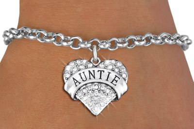 Exclusively Ours! Lead, Nickel & Cadmium Free!! Detailed Antiqued Silver Tone And Genuine Austrian Clear Crystal Covered "AUNTIE" Heart Charm Comes On A Bracelet Of Your Choice: Toggle Chain, Link Chain Or Black Suede Leatherette With Lobster Clasps.
