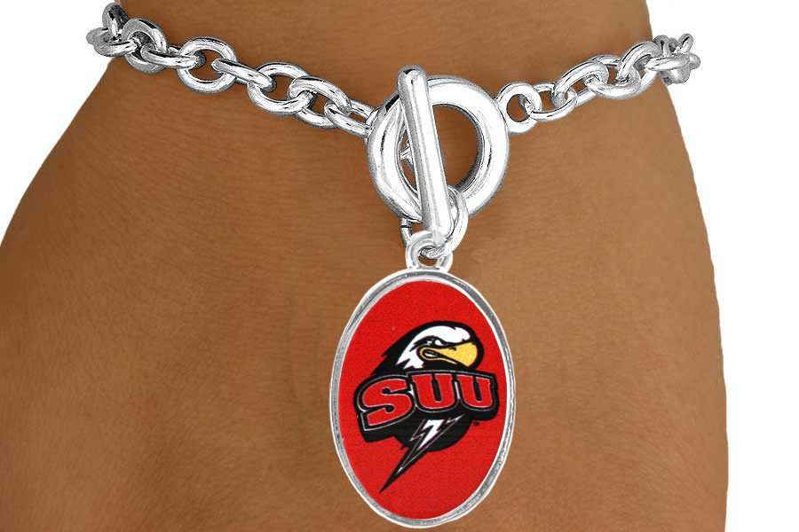 Licensed College Jewelry!! Lead & Nickel Free Sterling Silver Plated Toggle Bracelet Suspends An Oval With The Southern Utah University "Thunderbirds" Logo.