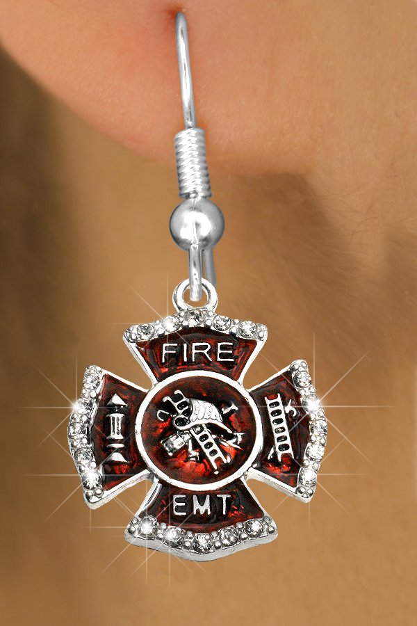 Exclusively Ours! Lead, Nickel & Cadmium Free!! Detailed Silver Tone And Red Epoxy Color-fill "FIRE EMT" Shield Charm With Genuine Austrian Clear Crystal Accents Comes On A Pair of Surgical Steel Fishhook Earrings.