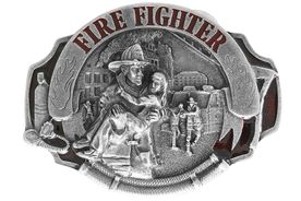 Made In The USA!! Lead & Nickel Free!! Pewter And Enamel Belt Buckle Displays A Scene Of Firemen Rescuing People From A Fire With The Words "Fire Fighter" At The Top. Please Note That The Belt Is Not Included With The Buckle.