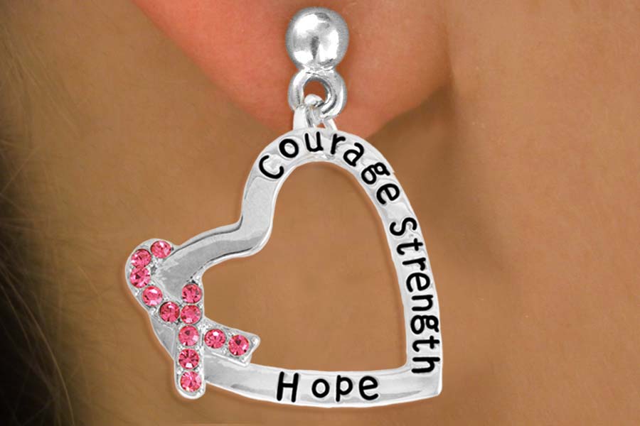 This Beautiful Heart Shaped Pink Ribbon Awareness Earrings Are The Perfect Gift To Honor A Friend, Loved One Or Yourself Who Has Overcome This Disease. You Or A Loved One Beat The Disease, Let The World Know By Wearing These Earrings. Silver Tone Cut Out Heart With The Words Courage, Strength And Hope Is Accented With An Austrian Crystal Pink Ribbon And Comes On A Post Earring.