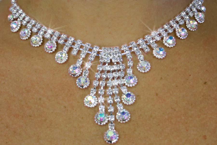Polished Silver Tone Lobster Clasp Necklace Is Designed With Clear Faceted Austrian Crystals. Along The Necklace Are Strands Of Austrian Crystals That Gradually Gets Longer And Then Shorter Again Creating A "V". At The Bottom Of Each Strand Is An Aurora Borealis Austrian Crystal That Reflects All The Colors Of The Rainbow. Necklace Includes Matching Earrings.