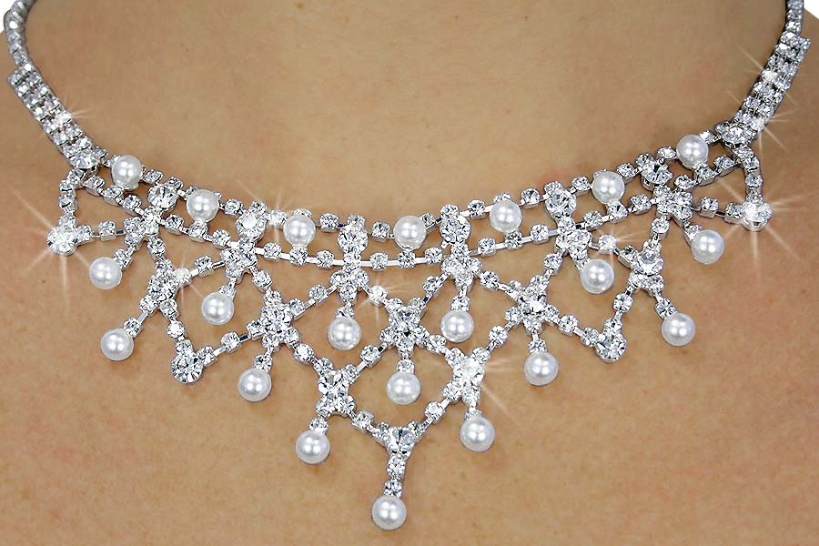 Lead & Nickel Free Lobster Clasp Necklace Sparkles With A Lattice Of Genuine Austrian Crystals Accented With Faux White Pearl Beads. Necklace Includes Matching Pierced Earrings.