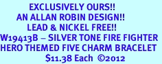 <Br>              EXCLUSIVELY OURS!!<Br>        AN ALLAN ROBIN DESIGN!!<Br>             LEAD & NICKEL FREE!! <Br>W19413B - SILVER TONE FIRE FIGHTER <BR>HERO THEMED FIVE CHARM BRACELET <BR>                      $11.38 Each  ©2012
