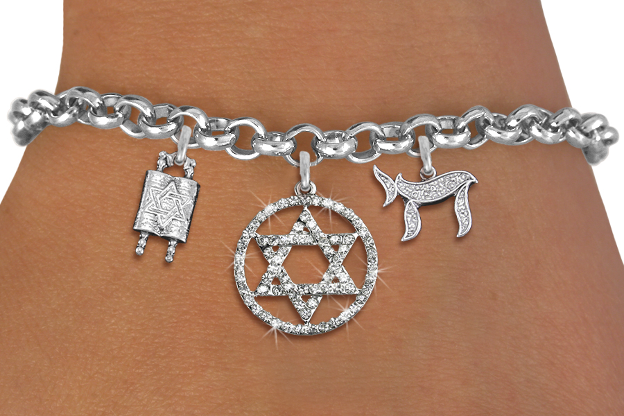 <bR>               EXCLUSIVELY OURS!!<BR>         AN ALLAN ROBIN DESIGN!!<BR>            LEAD & NICKEL FREE!! <BR>W19814B - JEWISH BAS MITZVAH <BR>TORAH SCROLLS AND JEWISH "CHAI" CHARMS <BR>AUSTRIAN CRYSTAL STAR OF DAVID CHARM <BR>BRACELET FROM $5.63 TO $12.50 ©2012