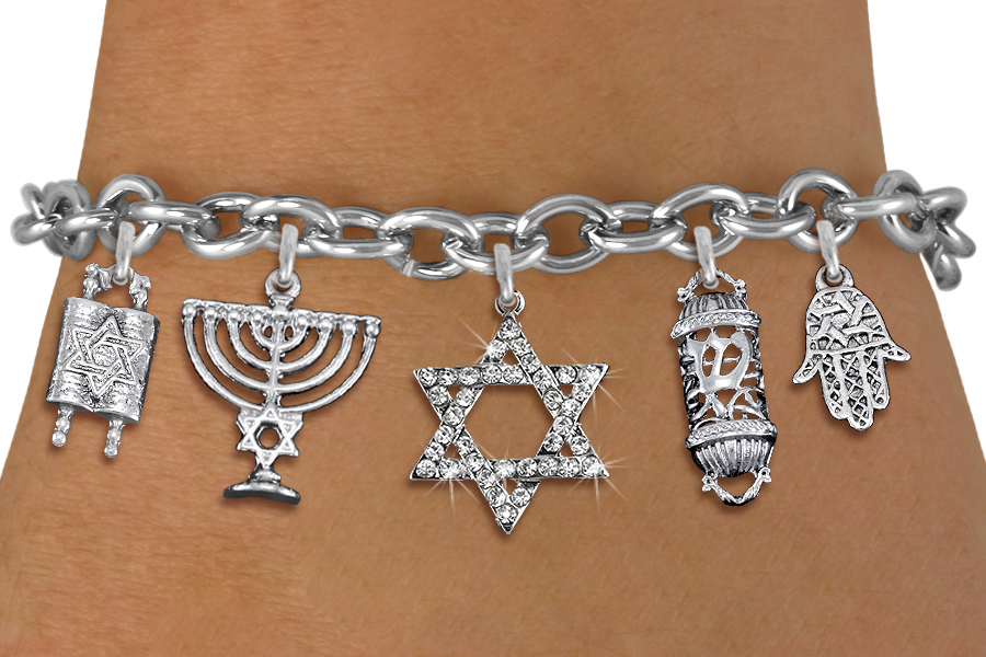 <bR>                EXCLUSIVELY OURS!!<Br>               LEAD & NICKEL FREE!!<BR>    W19887B - CHANUKAH THEMED <Br>SILVER TONE CHARM BRACELET WITH <BR>   CRYSTAL COVERED STAR OF DAVID <BR>  WITH JEWISH SILVER TONE CHARMS <BR>               FROM $7.31 TO $16.25