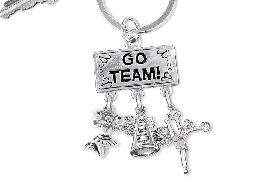 Exclusively Ours! An Allan Robin Design!! Lead & Nickel Free!! New! Silver Tone "GO TEAM!" Key Ring Comes With Cheerleader Themed Charms, Including A Jumping Cheerleader Charm, "Cheer" Megaphone Charm, And High Kicking Cheerleader Charm.
