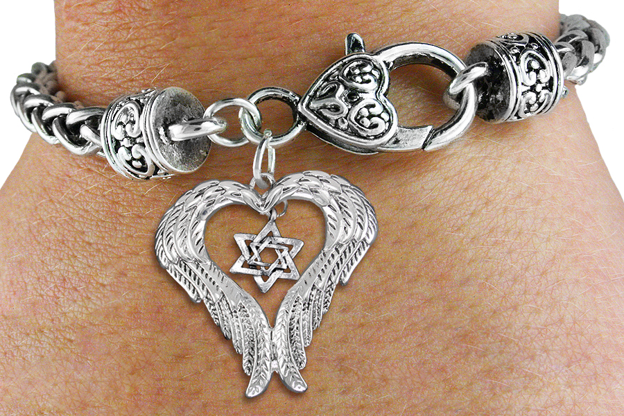 <BR>      WHOLESALE JEWISH JEWELRY<bR>               EXCLUSIVELY OURS!! <BR>             LEAD & NICKEL FREE!! <BR>  JEWISH THEMED CHARM BRACELET!! <BR>  W20273B - GUARDIAN ANGEL WINGS <Br> WITH DETAILED DOUBLE STAR OF DAVID <BR>    CHARM & HEART CLASP BRACELET <BR>      FROM $6.19 TO $13.75 ©2013