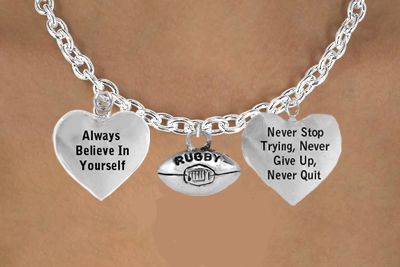 Exclusively Ours! An Allan Robin Design. Our Toggle Necklace And Charms Comply With All Laws, Lead, Nickel, & Cadmium Free!! Detailed Antiqued Silver Tone " Rugby Ball Charm" & "Never Stop Trying, Never Give Up, Never Quit" Heart Charm And "Always Believe In Yourself" Heart Charm Toggle Necklace. You May Also Add Additional Charms Of Your Choice On Each Side Of The Charms Shown Above, And See More Charms Below.