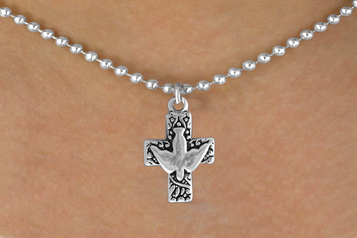 Exclusively Ours! Lead & Nickel Free Peace Dove & Cross Comes On A Necklace Style Of Your Choice: Ball Chain, Regular Chain, Black Suede Leatherette, Or Brown Suede Leatherette.
