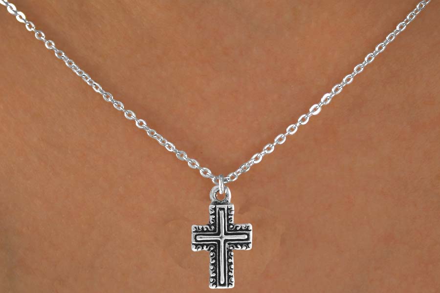 Exclusively Ours! Lead & Nickel Free Curlicue Trimmed Cross Comes On A Necklace Style Of Your Choice: Ball Chain, Regular Chain, Black Suede Leatherette, Or Brown Suede Leatherette.