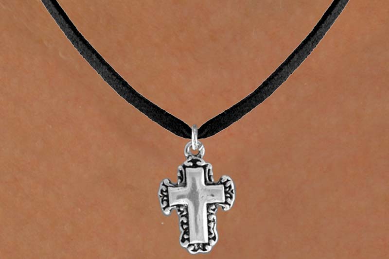 Exclusively Ours! Lead & Nickel Free Lace Trim Cross Comes On A Necklace Style Of Your Choice: Ball Chain, Regular Chain, Black Suede Leatherette, Or Brown Suede Leatherette.
