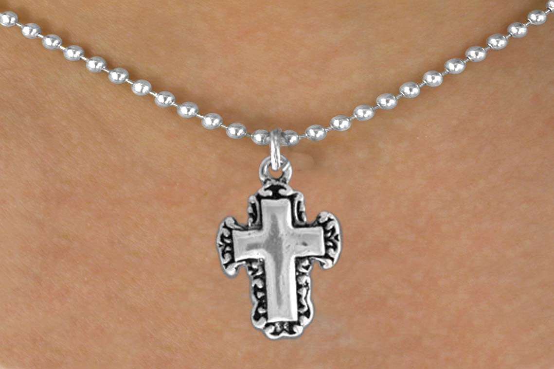 Exclusively Ours! Lead & Nickel Free Lace Trim Cross Comes On A Necklace Style Of Your Choice: Ball Chain, Regular Chain, Black Suede Leatherette, Or Brown Suede Leatherette.