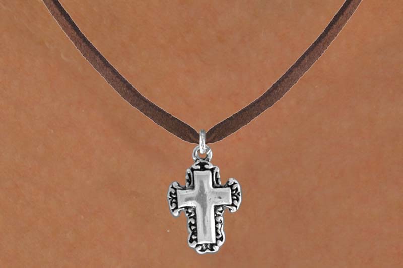 Exclusively Ours! Lead & Nickel Free Lace Trim Cross Comes On A Necklace Style Of Your Choice: Ball Chain, Regular Chain, Black Suede Leatherette, Or Brown Suede Leatherette.