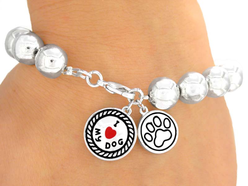 Silver Finish Ball Stretch/Lobster Clasp Bracelet Dangles A Paw Print Drop Next To An "I Love My Dog" Drop.
